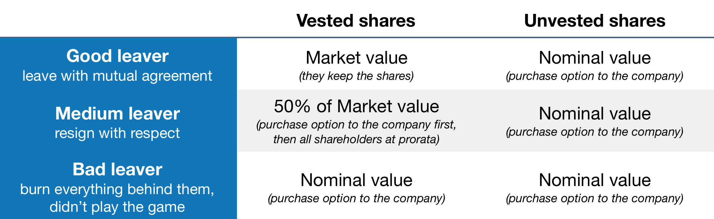 However, as discussed before, every founder will know their leaver. In any case, it’s better to have a fair negotiation point written beforehand in order to defuse possible frustrations as quickly as possible, and to spawn possible negotiations from a friendly beginning.